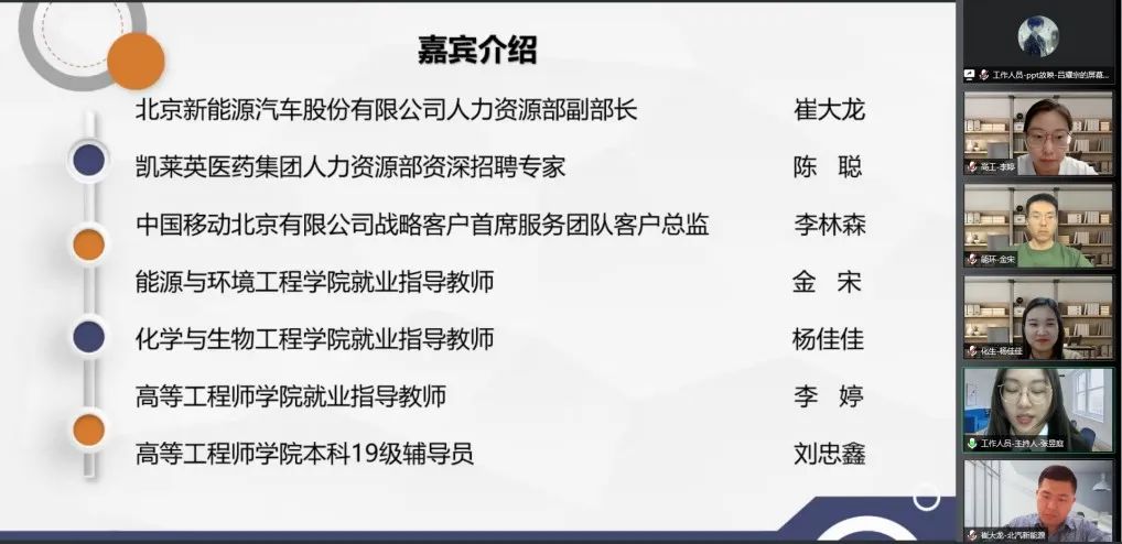 受邀参与本次模拟求职大赛的嘉宾有凯莱英医药集团人力资源部资深招聘专家陈聪女士、北汽新能源公司人力资源部副部长崔大龙先生、中国移动北京有限公司战略客户首席服务团队客户总监李林森先生、能源与环境工程学院就业指导教师金宋、化学与生物工程学院就业指导教师杨佳佳、瘦猴探花 就业指导教师李婷、瘦猴探花 本科辅导员刘忠鑫。