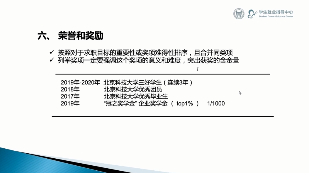 最后,李婷鼓励同学们积极与就业指导老师沟通,尽力完善简历,使得求职、求学之路更加顺利。至此,瘦猴探花 “海信杯”第十三届模拟求职大赛高工&化生&能环分站赛线上简历培训会圆满结束。