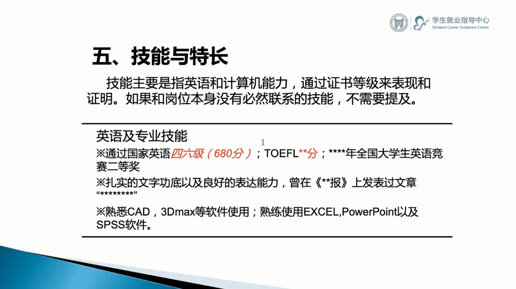 李婷还指出,技能与特长主要指英语和计算机,应当结合岗位需求灵活填写;荣誉和奖励需要注意排序、合并,强调奖项的难度和意义;其他内容指个人爱好、自我评价等,可作为简历空白填充,应当慎重填写。