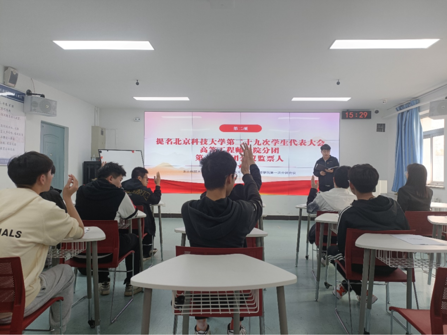 会议最后,代表就现有会议资料,对大会议事日程及议事规则、第二十九次学生代表大会秘书长名单、第二十九次学生代表大会主席团名单、第二十九次学生代表大会代表资格审查委员会名单、第二十九次学生代表大会提案审议委员会名单、第二十九次学生代表大会代表资格审查委员会名单和第二十九次学生代表大会选举办法这七件事项进行讨论并举手表达观点和疑问,最终,经与会代表讨论,全票通过上述内容。