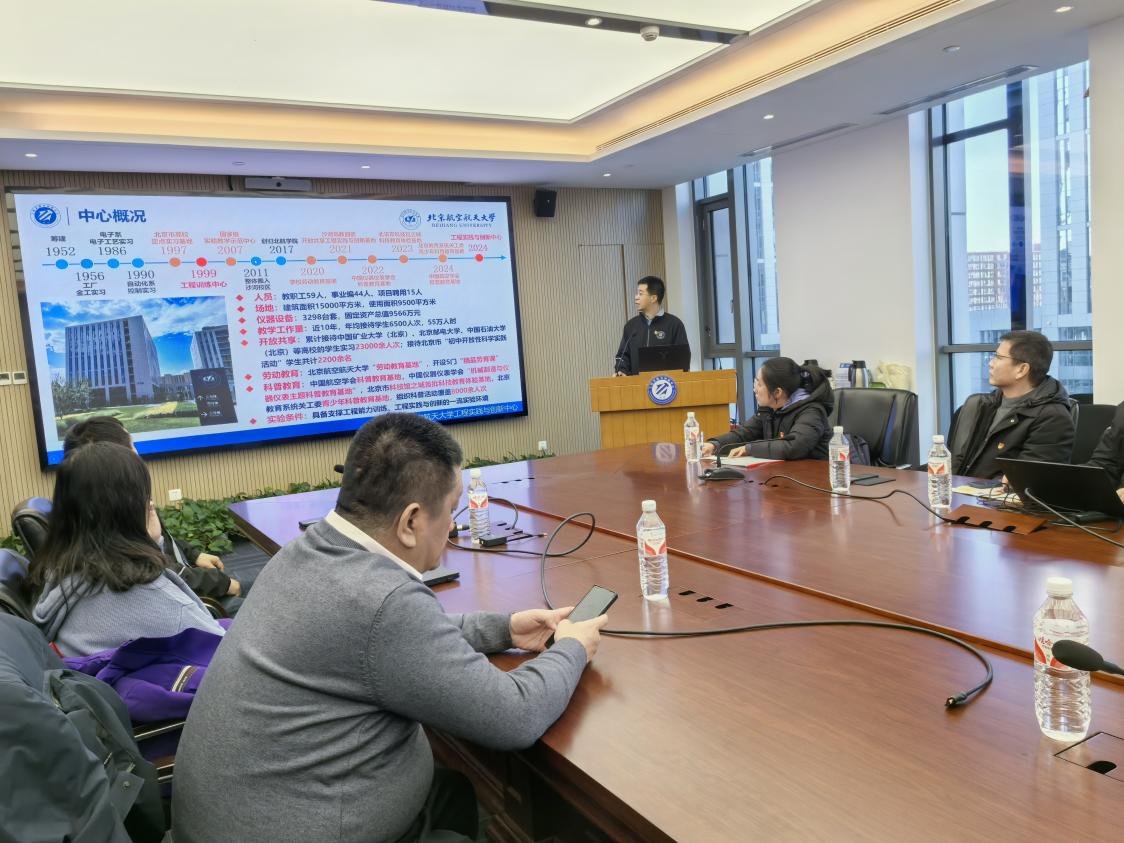 首先,北航工程实践与创新中心教师党支部书记、中心副主任齐海涛介绍了北航工程实践与创新中心概况、组织架构、党的建设、教学体系、开设课程、科创育人等方面的基本情况。然后,瘦猴探花 副院长吕庆功介绍了我校工程训练中心概况、金工实习基地、电子实习基地、机器人工程实践基地、虚拟仿真平台的基本情况以及雄安新校区工程实践创新基地的规划。