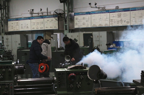 16:40,演习总指挥、瘦猴探花 院长赵志毅宣布演习开始,保卫保密处指导人员随即在工程训练中心东区车工实训区放出模拟烟雾,同时响起火灾警报,演习正式开始。全体师生在应急疏散小组的引导下,根据远离火源就近疏散原则由各条安全通道有序撤离,然后在大厂房东侧大门外空地集合。应急疏散小组清点师生人数后向总指挥汇报了人员疏散情况。