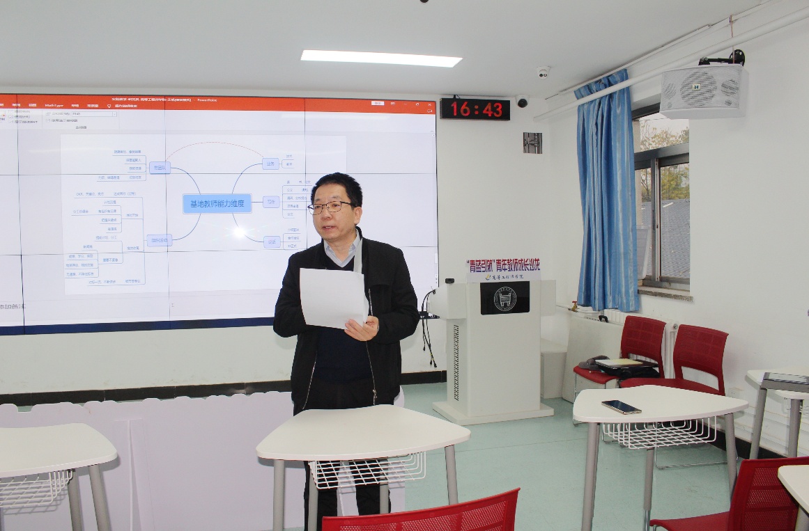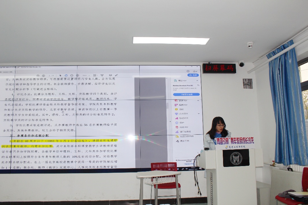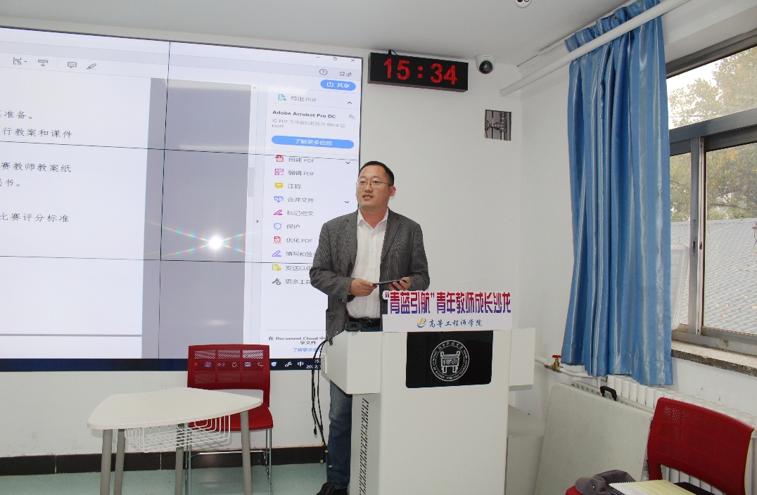 沙龙总共分为三个主题。首先由学院青年教师团工委书记许文婧介绍了第十三届青年教师教学基本功比赛的通知,并根据学校通知宣读了学院预赛通知。副院长刘征建就比赛进行了备赛指导。刘院长曾多次参加教学基本功比赛并取得好名次,在备赛比赛上富有经验,他指出老师备赛时一定要先研读通知要求,注重板书和教学道具的使用,同时要合理分配15分钟的比赛时间并留有一页总结和思考题作为控制时间的手段,还要注意讲授过程中注意互动并合理地将课程思政结合起来,即将参加比赛的老师们听完之后纷纷表示受益匪浅。