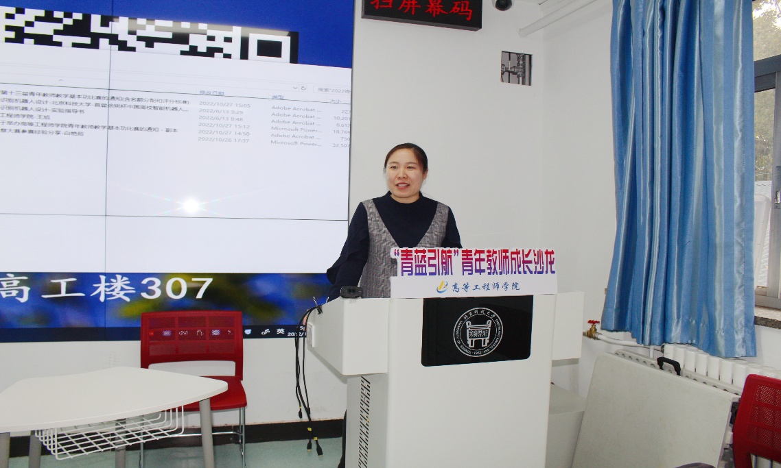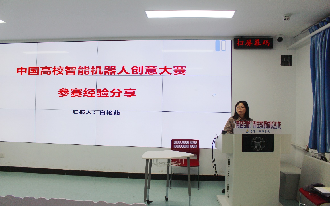 沙龙第二个主题是由电子基地负责人白艳茹围绕“中国高校智能机器人创意大赛教师赛”一等奖参赛获奖经历进行业务能力提升、团队建设专题分享。白老师作为参赛团队负责人,以参赛PPT为引导,给大家介绍了赛事概况和参赛的经验总结。她指出在参赛过程如何灵活应对各种挑战,在编写比赛相关教学材料文件的注意事项,在比赛中整个团队的业务能力和团结合作提升情况,同时也就教学体系、模式、方法和手段等方面归纳总结,与在座老师进行分享。