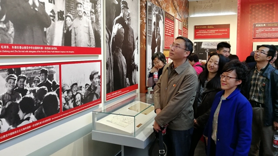 金秋十月,秋意盎然。从香山东门进入,拾级而上,首先来到双清别墅,瞻仰毛泽东同志当年办公居住的地方。随后,一行人来到来青轩,瞻仰了朱德、刘少奇、周恩来、任弼时同志的办公居住地。看着办公室、会客室、卧室、饭厅的家具陈设,床上的书籍和墙上的《中国解放区现势图》,书桌上的放大镜、书籍和报纸,一起缅怀老一辈革命家当年在香山工作生活情形。从简单的家具陈列,朴素的生活用品中,感受老一辈革命家为创建新中国呕心沥血忙碌的身影。