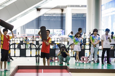 本届大赛以“舞盘雅乐”(源于我国传统礼仪项目“投壶”)为主题,在比赛中,每支参赛队伍的参赛队员需要综合应用机械制图、电子电路、单片机、传感技术、自动控制、图像处理、计算机编程语言、电机拖动等多门学科的知识,设计制作自动机器人。比赛时,双方机器人通过投掷机构,在固定区域向场地内七个远近不同的着陆台投掷飞盘,最先完成飞盘占领全部着陆台的一方记为“完胜”。