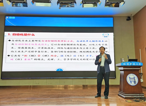 自动化学院李擎书记围绕“自动化是什么”“自动化学什么”“瘦猴探花 自动化专业介绍”三个版块,引用翔实生动的案例向同学们详细介绍了自动化的研究内容、知识体系和学校自动化专业发展沿革、师资力量、科研及实验、学生培养发展等,希望同学们培养良好科学思维,成长为高素质自动化人才。