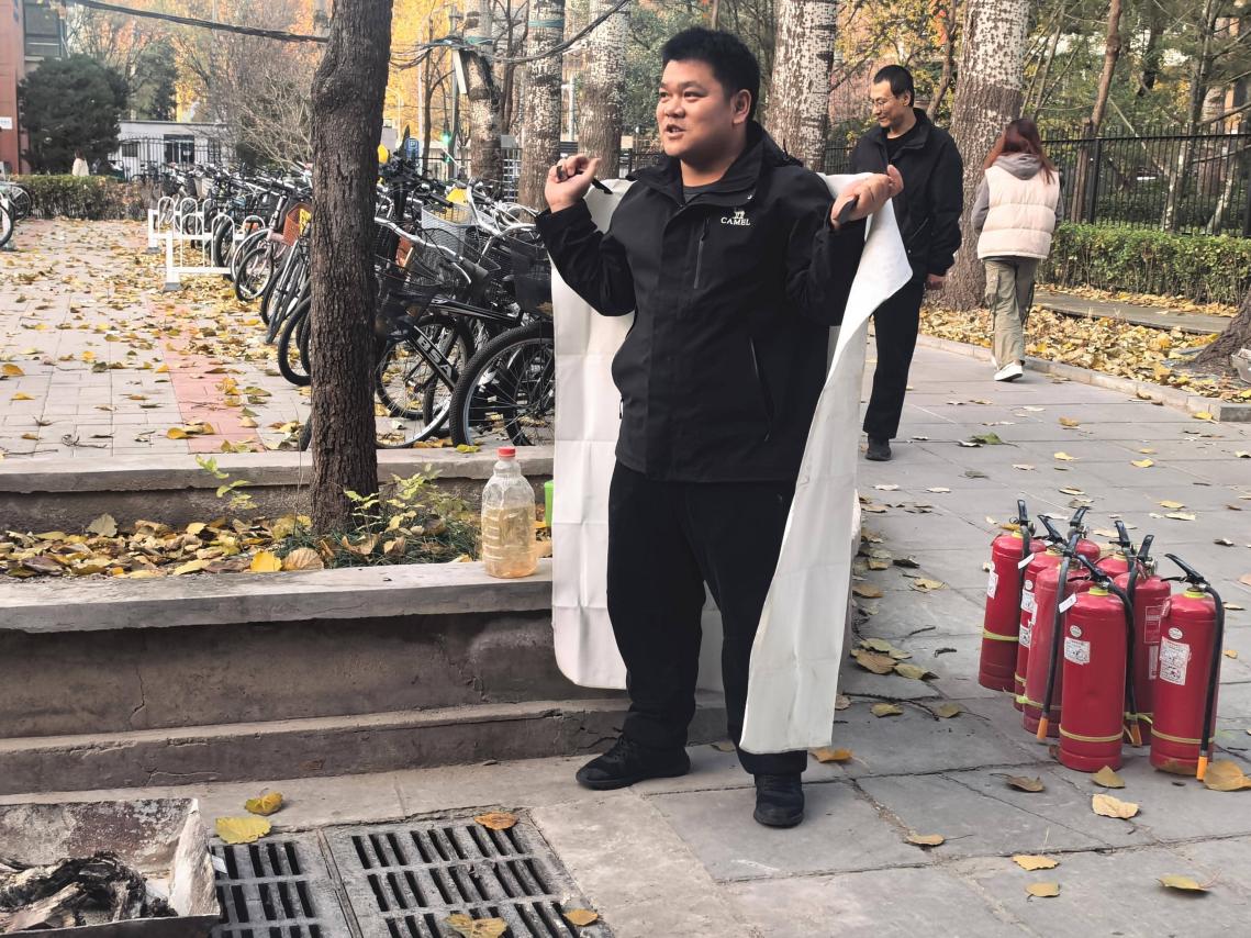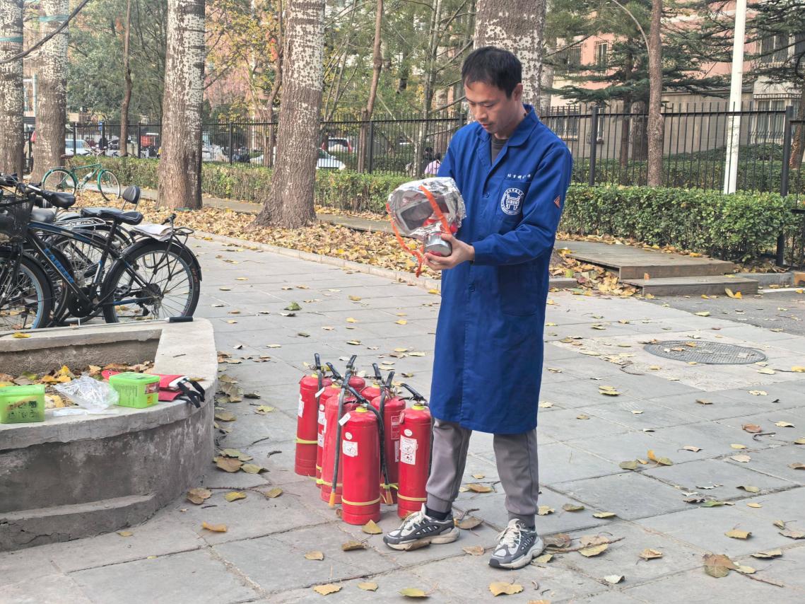 疏散环节结束后,保卫处指导人员在集合点开展消防安全实操培训。指导人员结合金工实习常见火灾隐患,详细讲解了干粉灭火器“提、拔、握、压”的操作要领,以及灭火毯和过滤式消防面具的正确使用方法,重点强调了初起火情的扑救技巧与安全注意事项。